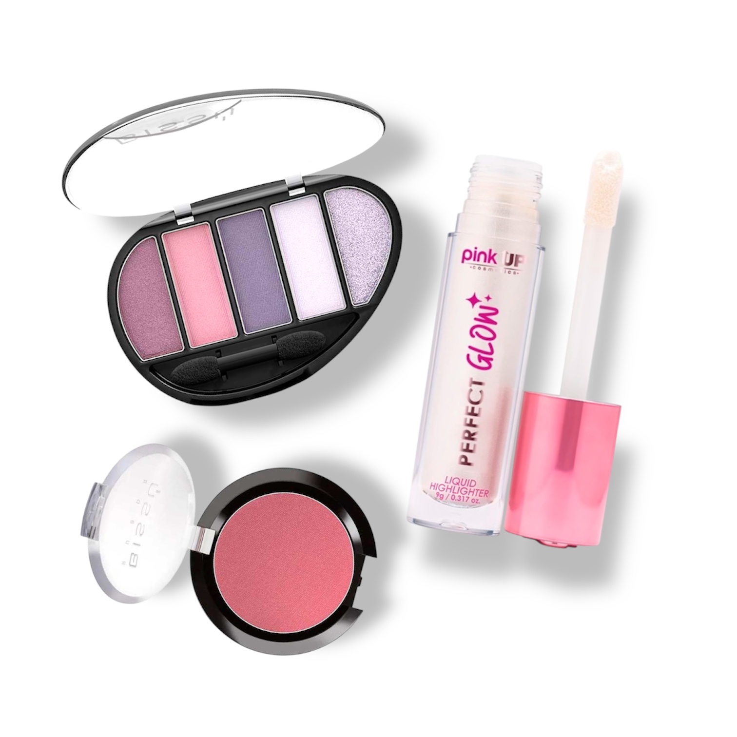Kit de rostro con sombra, rubor e iluminador. Tonos suaves, juveniles y súper favorecedores.