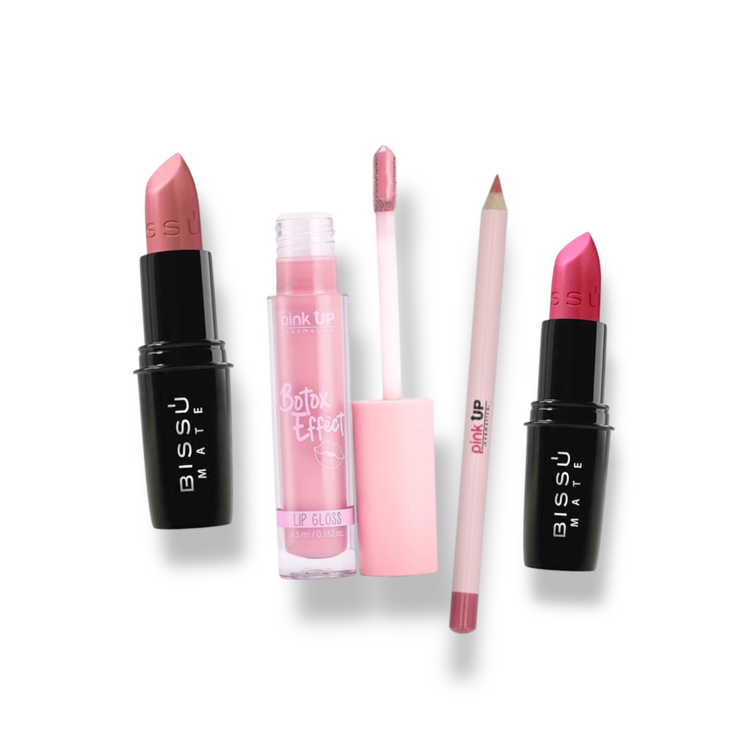 Incluye 2 lipsticks diferentes, un liner cremoso y un gloss brillante que juntos hacen que tus labios se vean más definidos, jugosos y bonitos sin esfuerzo.